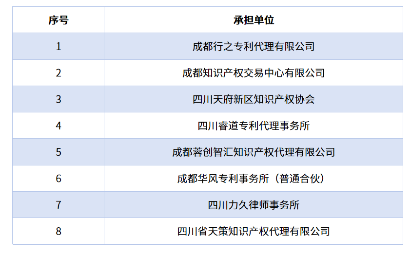 以下8个单位为成都市知识产权托管中心项目的承担单位,为中小微企业、大专院校、科研院所、大型企业、龙头企业等托管对象,提供包括知识产权管理、知识产权战略咨询、知识产权供需对接、知识产权保护和知识产权培训在内的托管服务,提升创新主体知识产权创造、运用、保护和管理能力,支撑企业创新发展,促进高校院所等创新主体知识产权转化和实施。
