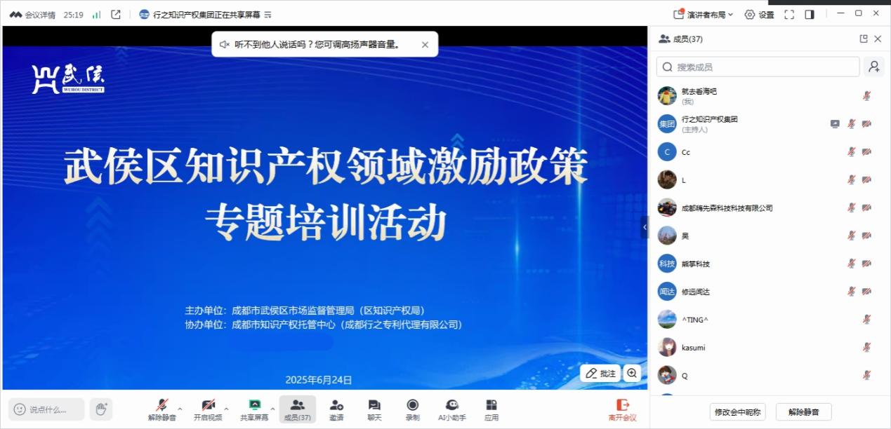 为推动知识产权政策精准落地,帮助企业充分把握政策红利,提升知识产权综合运用能力,2025年6月24日,由成都市武侯区市场监督管理局(区知识产权局)主办,成都市知识产权托管中心(成都行之专利代理有限公司)承办开展“武侯区知识产权领域激励政策解读专题培训”,吸引60余家企业线上参与。