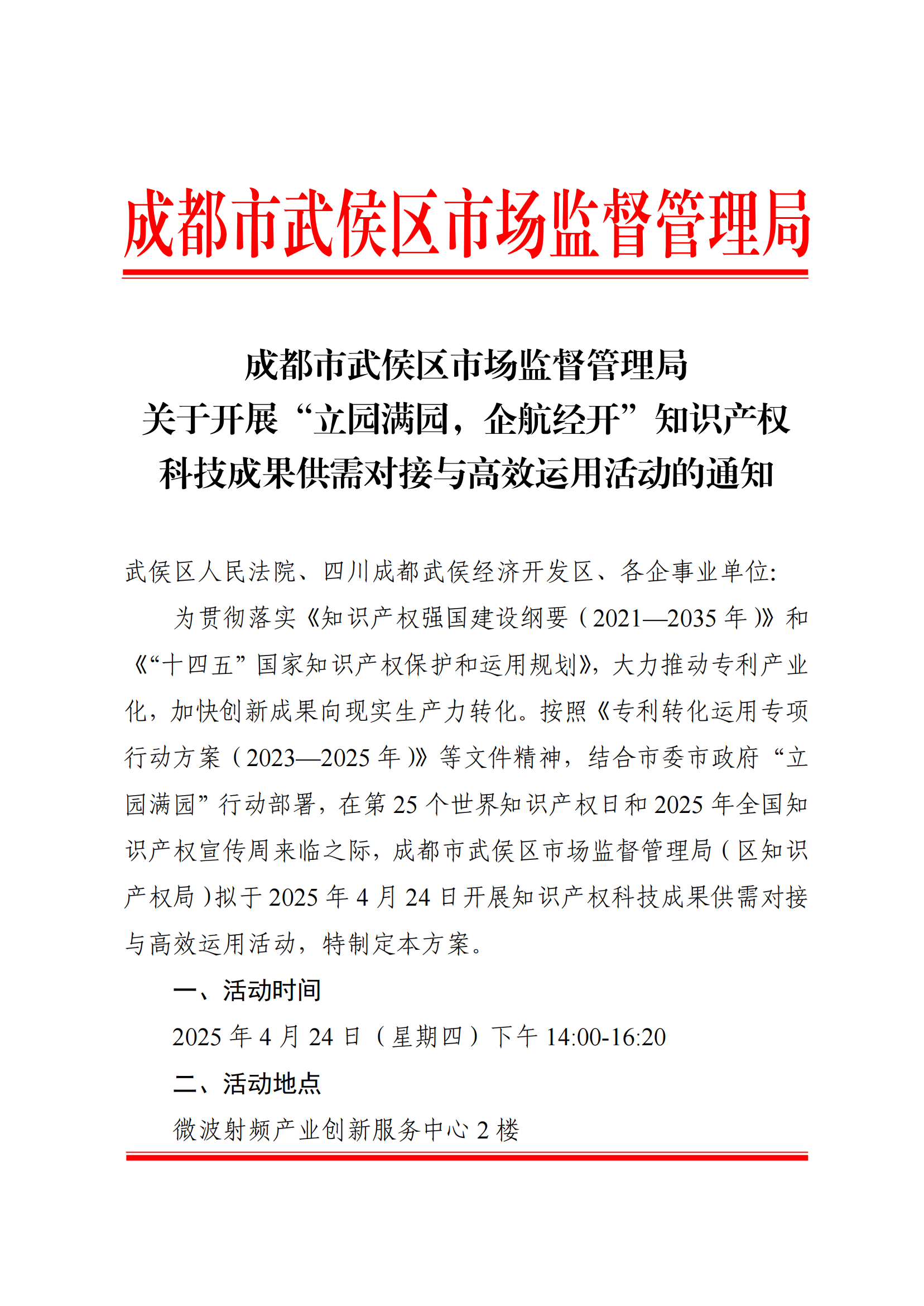 成都市武侯区市场监督管理局 关于开展“立园满园,企航经开”知识产权 科技成果供需对接与高效运用活动的通知